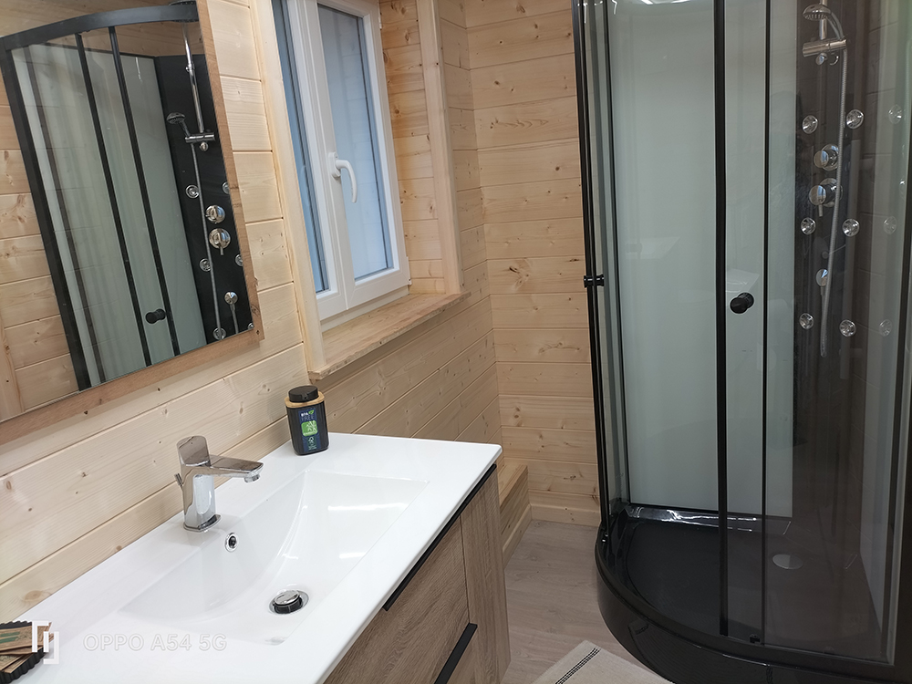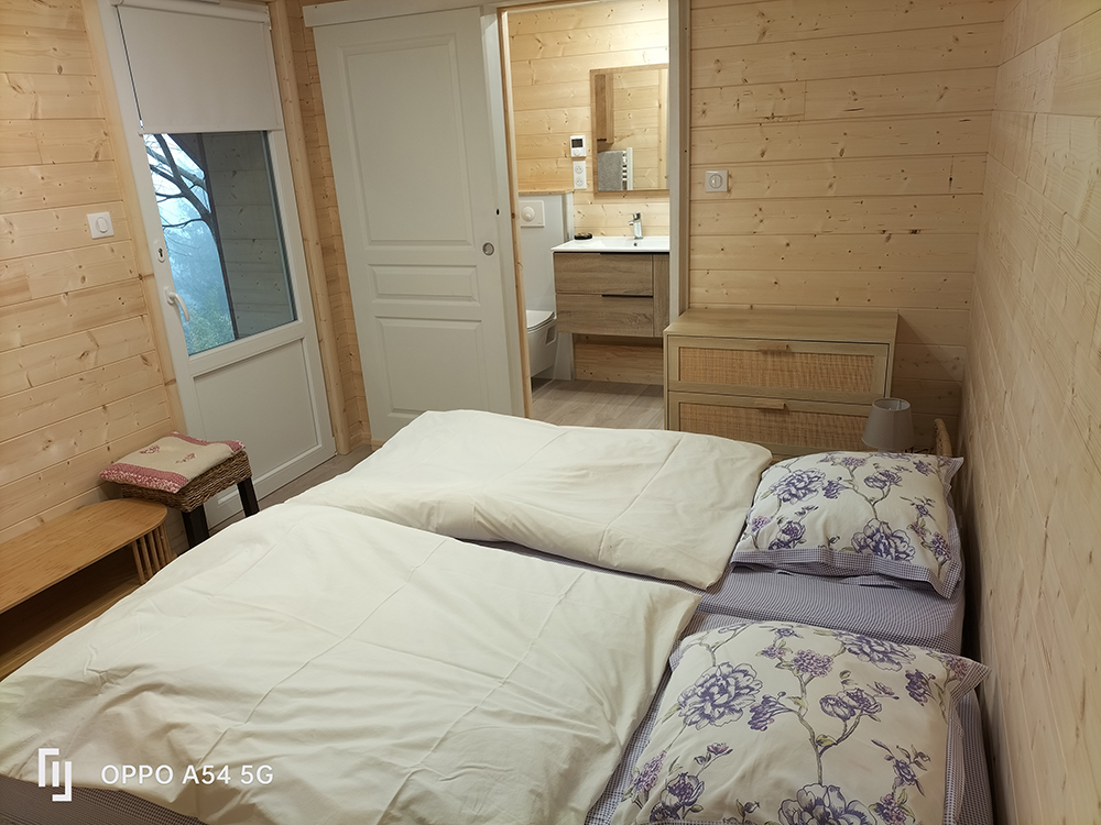 2 lits de 90 cm avec 2 chevets et salle de bain avec WC